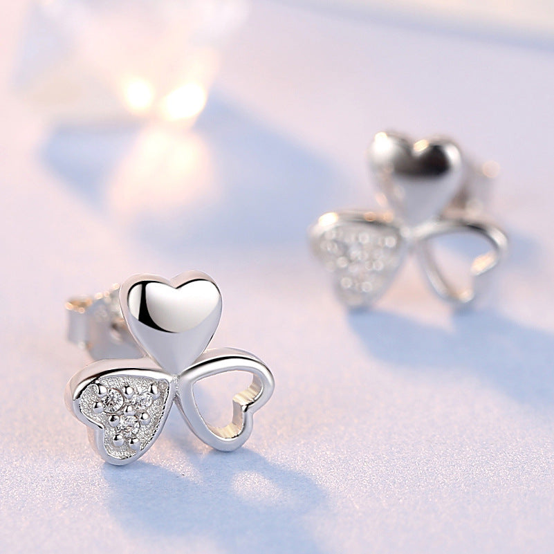 925 Silver Lucky Clover Zircon Stud Earrings Flower Cute