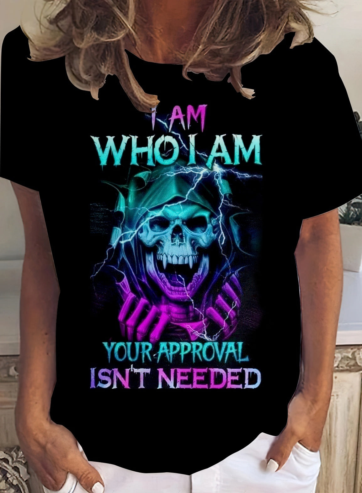 Skull Pattern T-Shirt - Comfortable polyester short-sleeved crewneck with a bright print - ideal for casual wear in spring and autumn