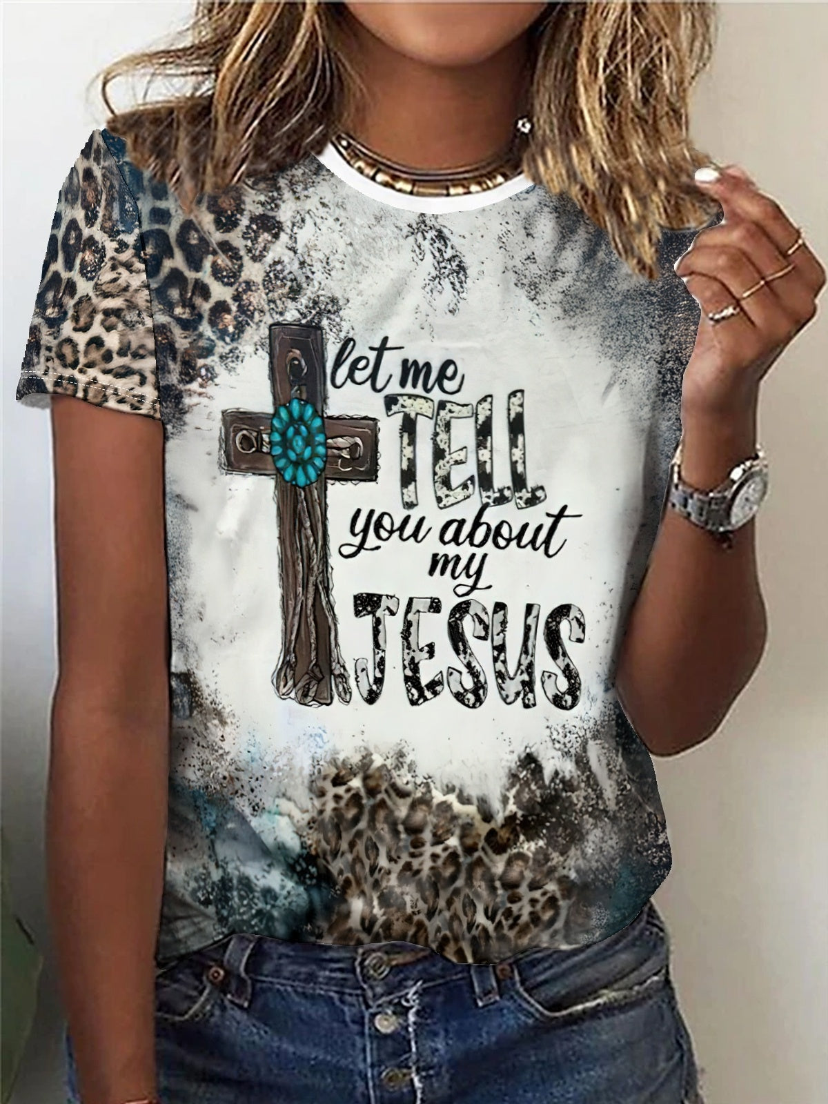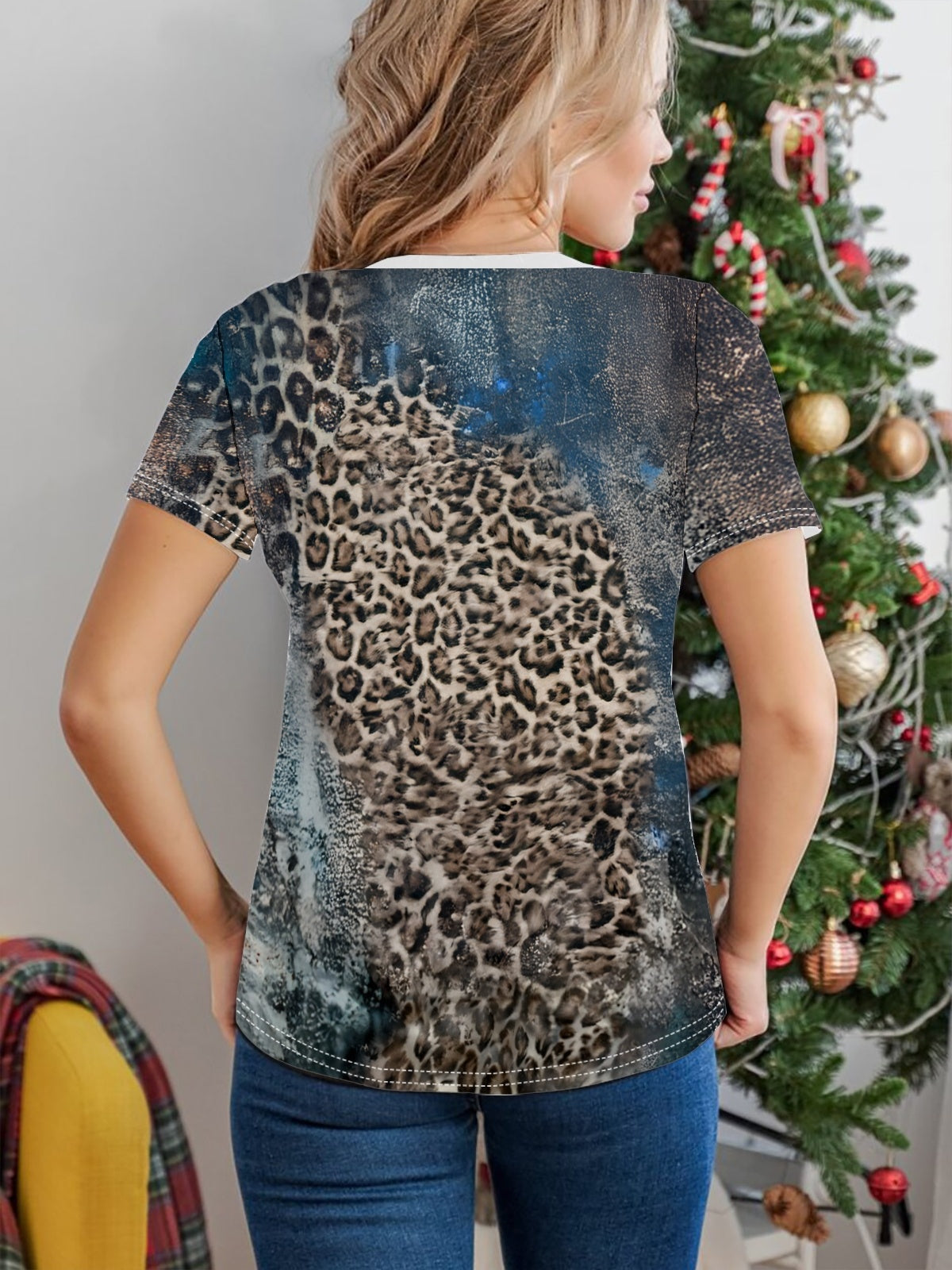 Women's leopard print T-shirt with cross pattern - Design - Comfortable short-sleeved crewneck - Perfect for spring and fall casualwear