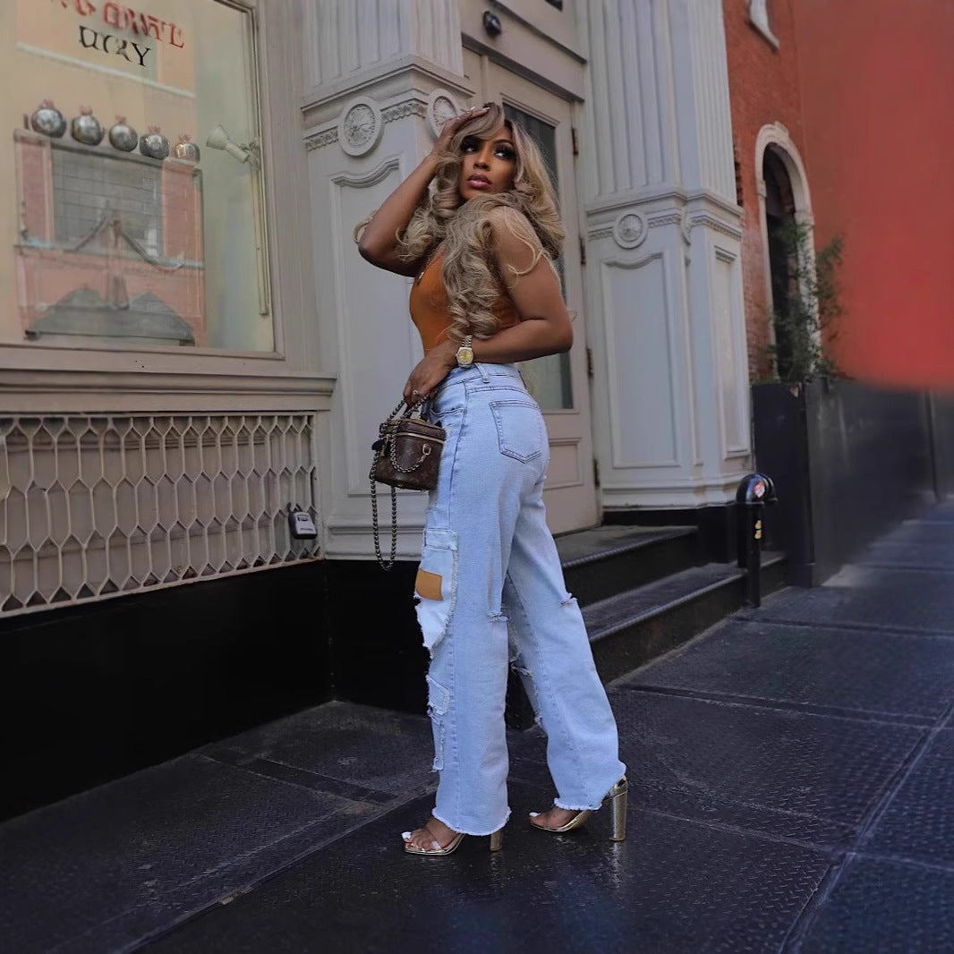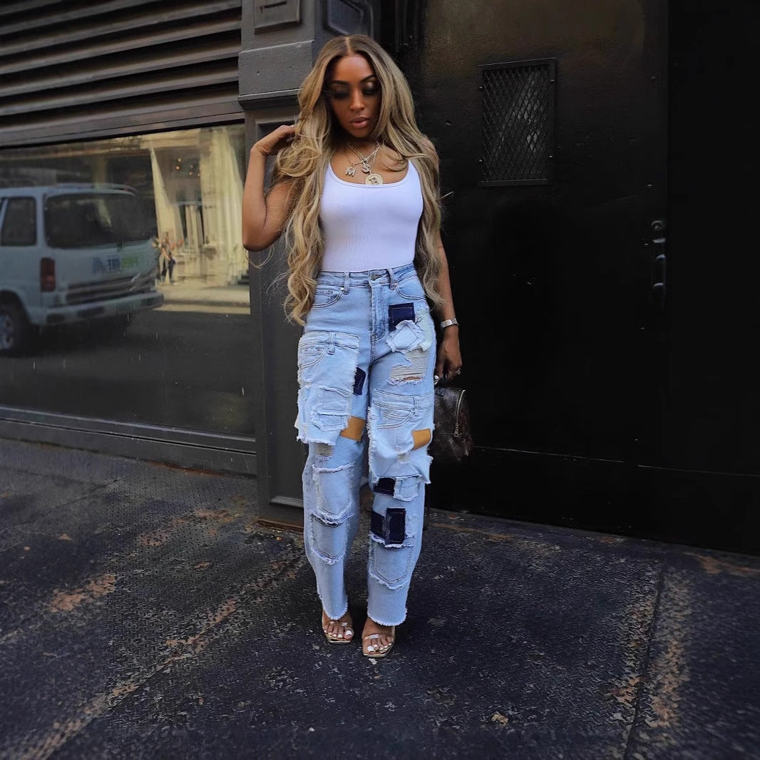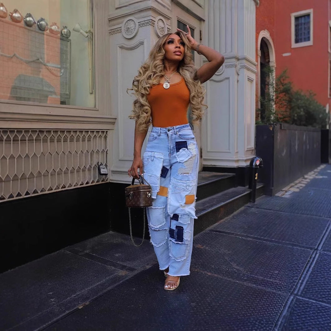 Casual Printed Patch Hole Denim Straight-leg Pants